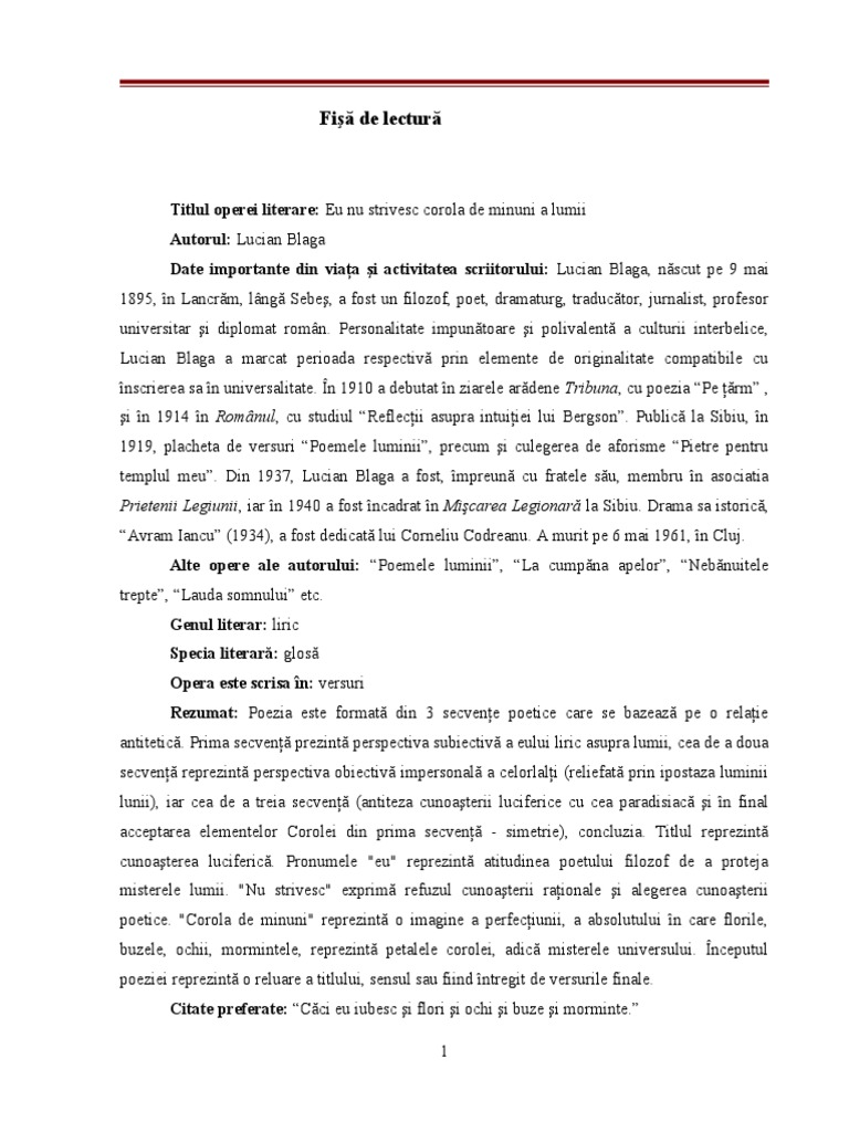 Fisa De Lectura Dorinta De Mihai Eminescu