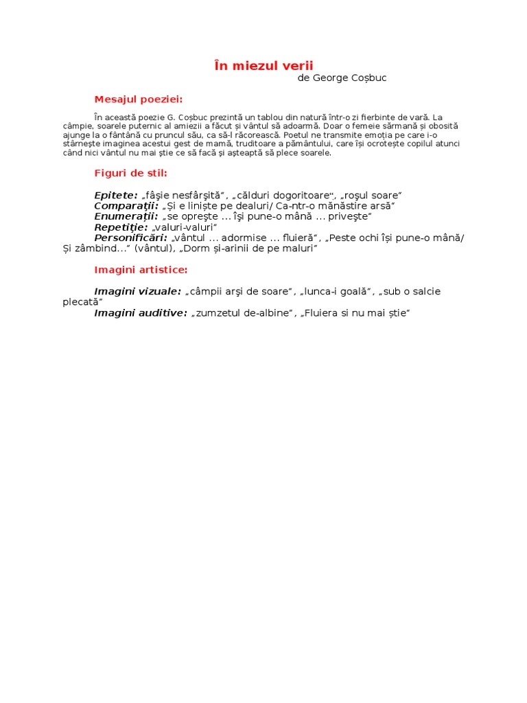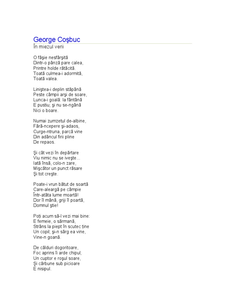 In Miezul Verii De George Cosbuc Anideșcoală Ro