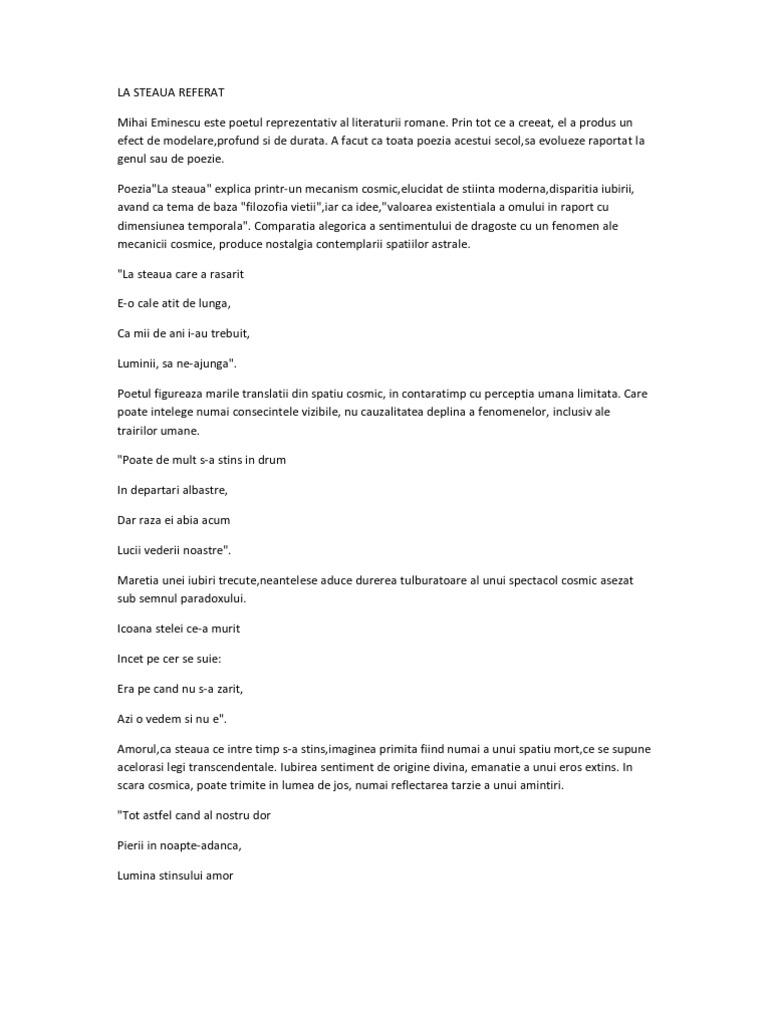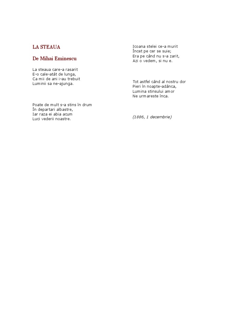 La Steaua Referat Mihai Eminescu Este Poetul Reprezentativ Al Literaturii Romane