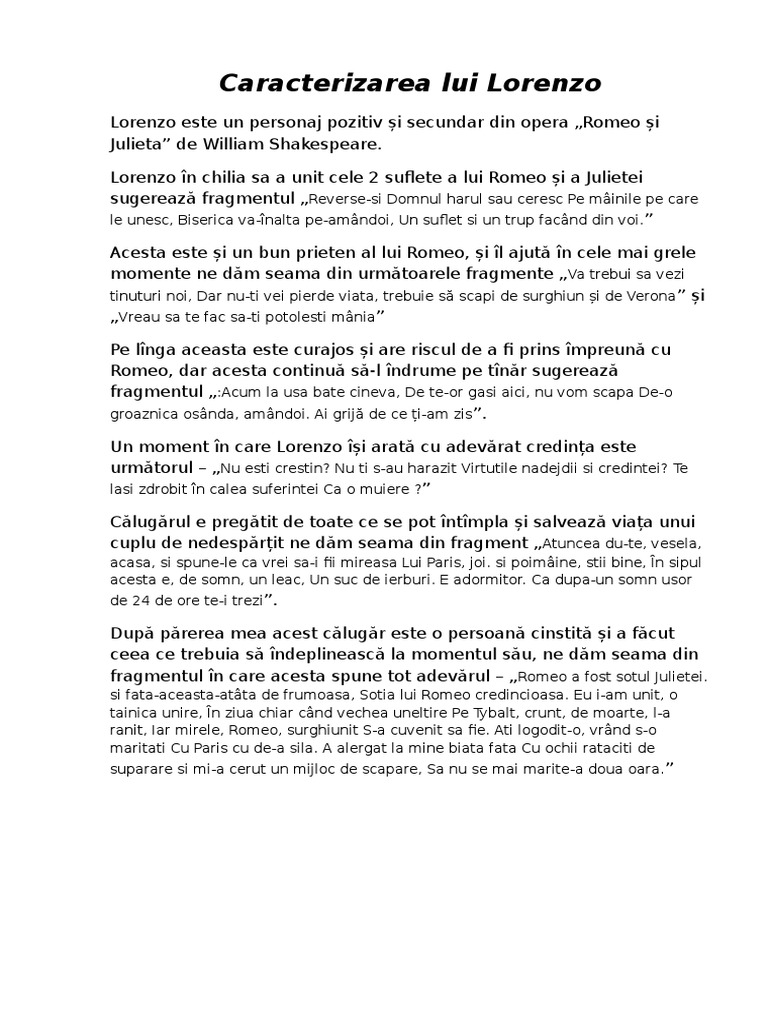 Caracterizarea Lui Lorenzo Din Opera Romeo și Julieta De William Shakespeare