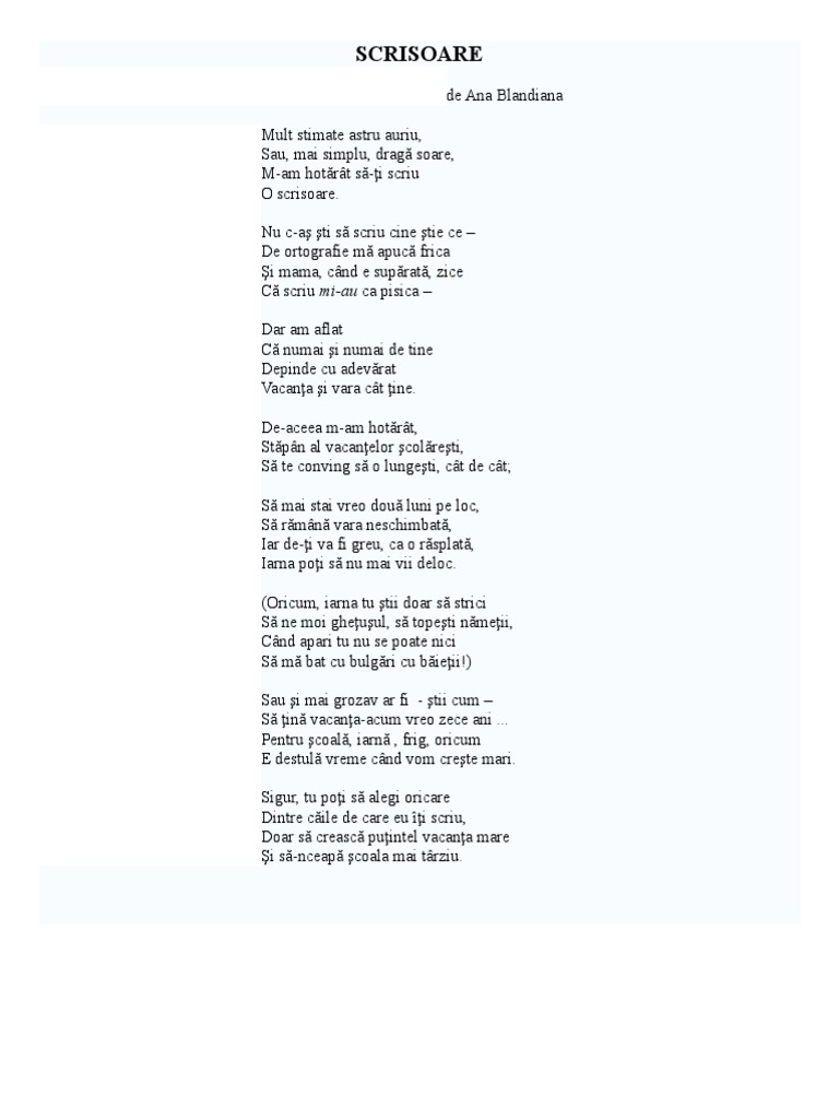 Completează Enunturile Urmatoare Care Se Refera La Poezia Scrisoare De Ana Blandiana In A Brainly Ro