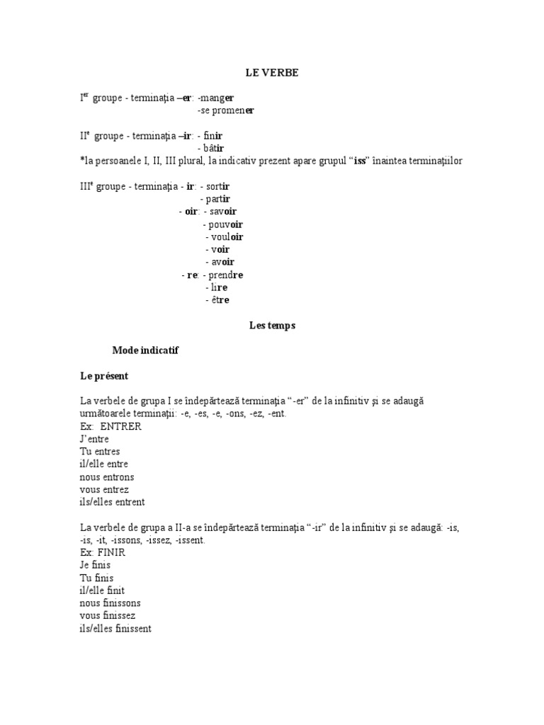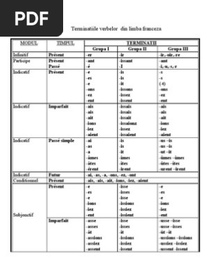 Terminatiile verbelor in franceza. In limba franceza exista 3 grupe de verbe grupa i terminate la infinitiv in er grupa ii terminate la infinitiv in ir grupa iii terminate la infinitiv in oir ir re prezentul verbelor de grupa i se formeaza din radicalul infinitivului la care se adauga terminatiile. După ce ai învățat să conjugi un verb regulat din fiecare categorie vei putea conjuga majoritatea verbelor limbii franceze. Cu instrumentul nostru de conjugare a verbelor în limba franceză poți căuta conjugări după prima literă a verbului căutat. Verbe care își schimbă rădăcina aceste verbe au terminația er dar rărăcina se schimbă la conjugare în funcție de subiect payer essayer appeler rejeter.