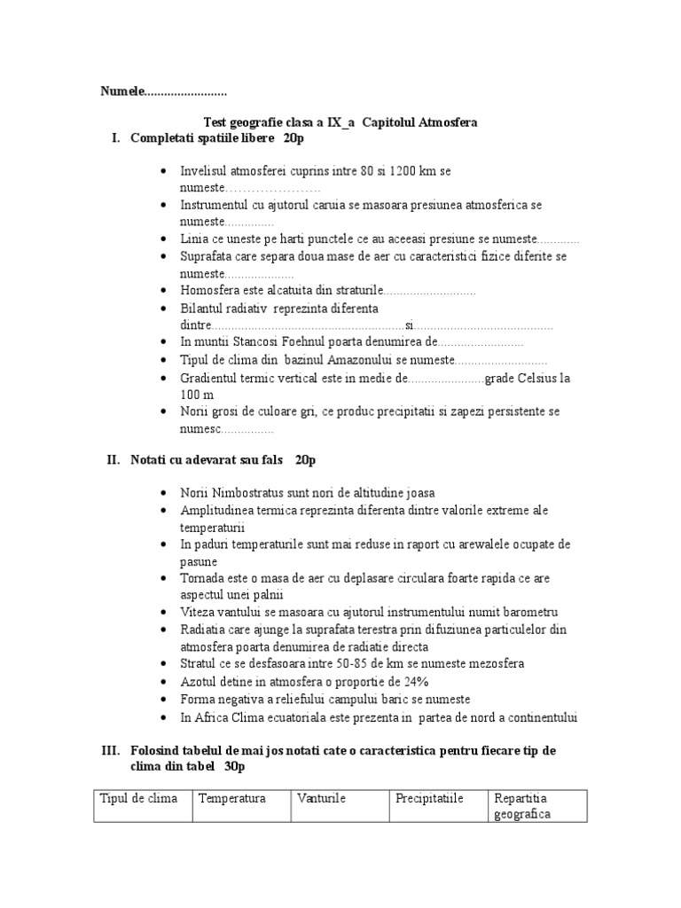 Test Geografie Clasa A Ix A Capitolul Atmosfera
