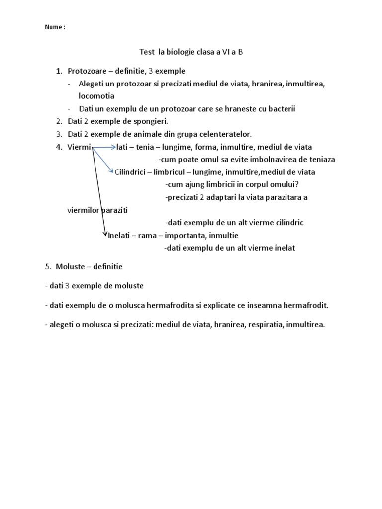 Test La Biologie Clasa A Vi A B Protozoare Moluste